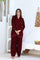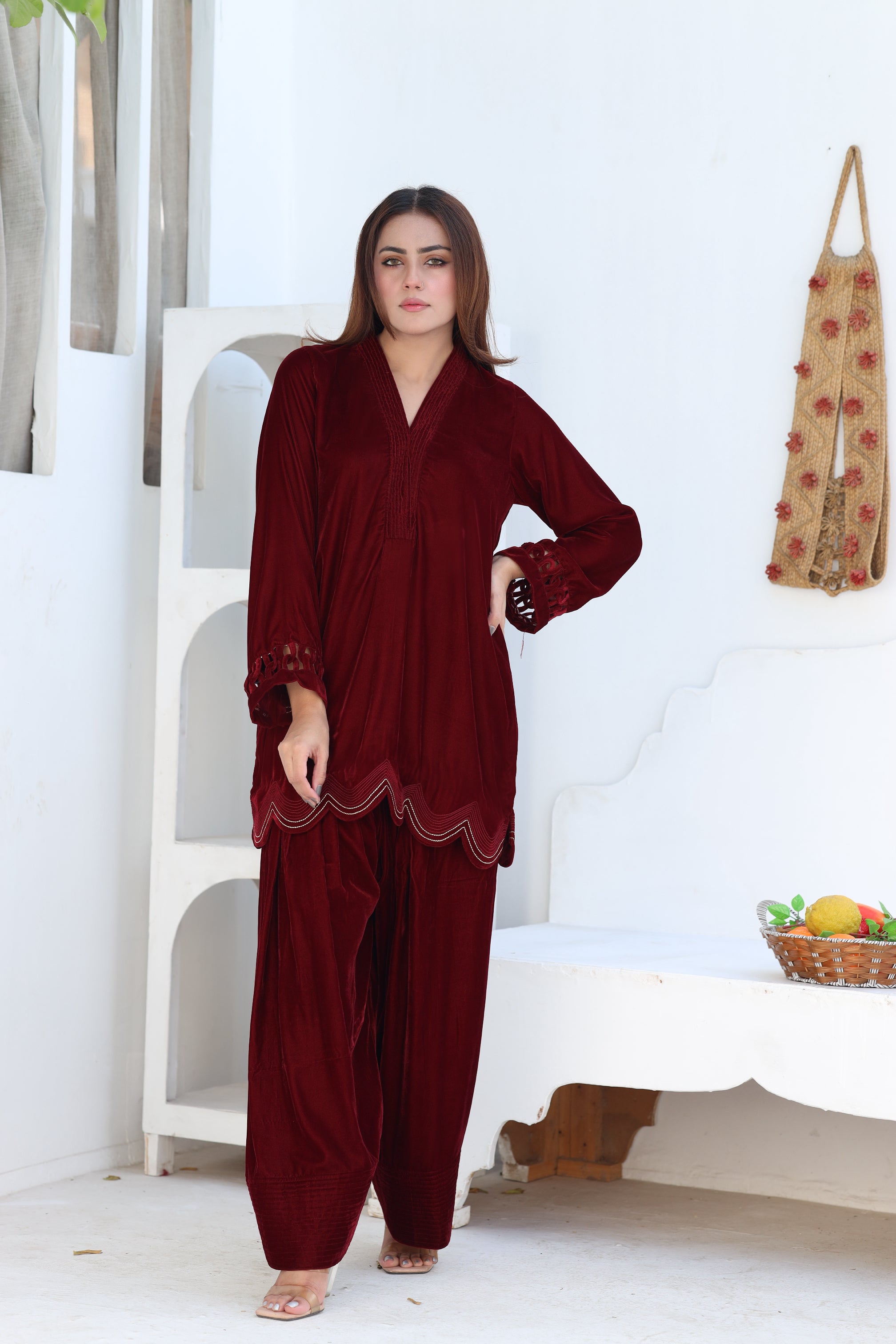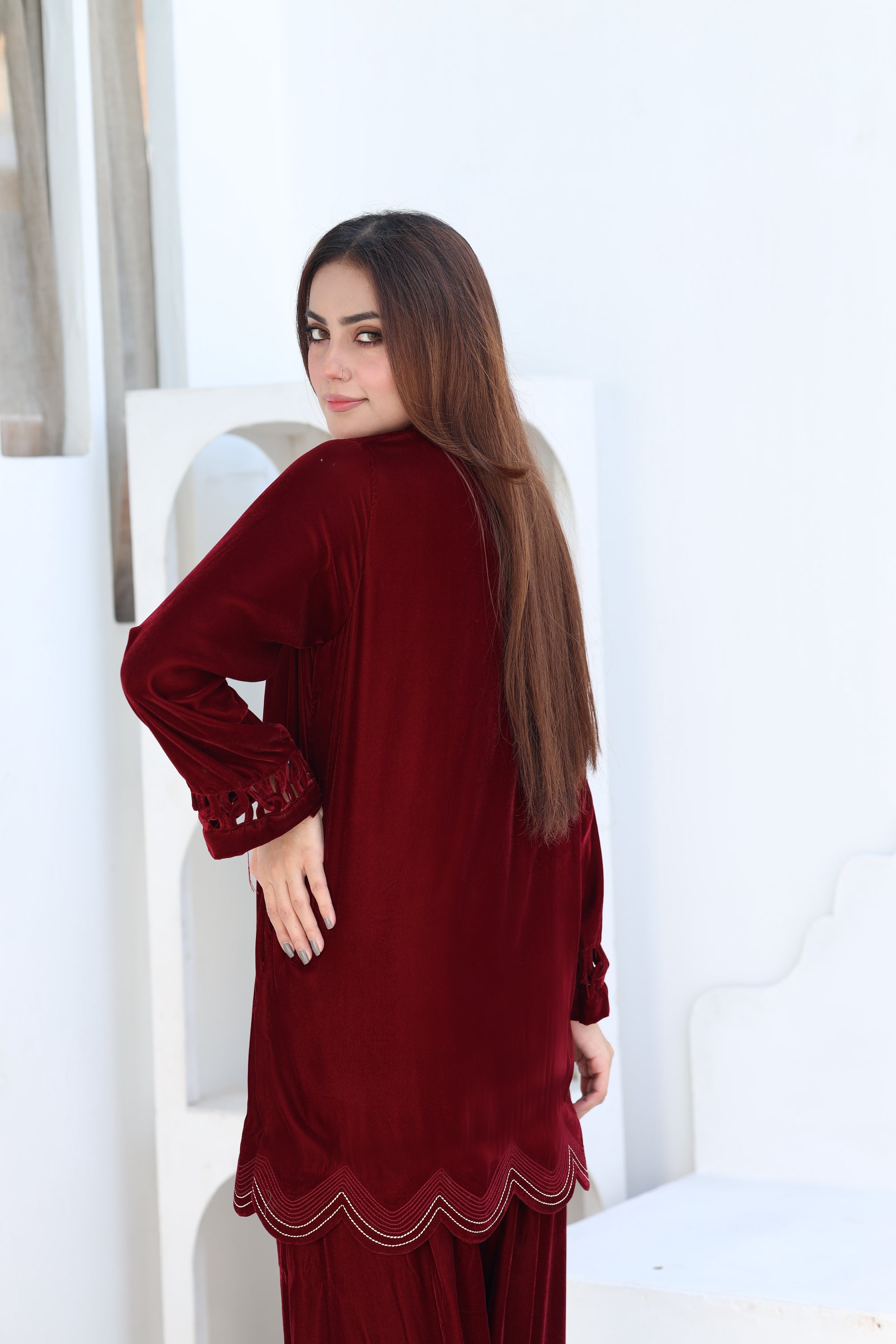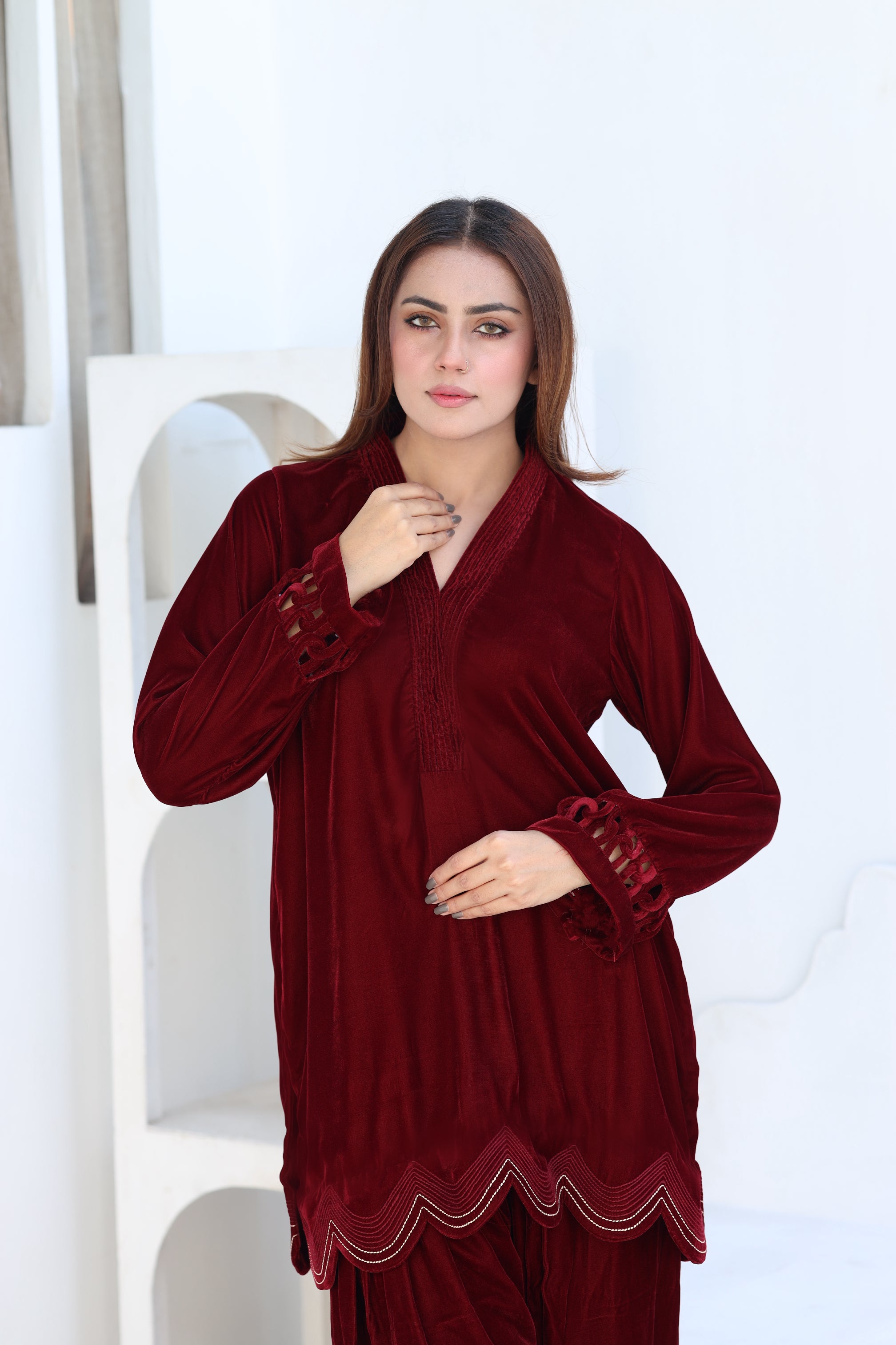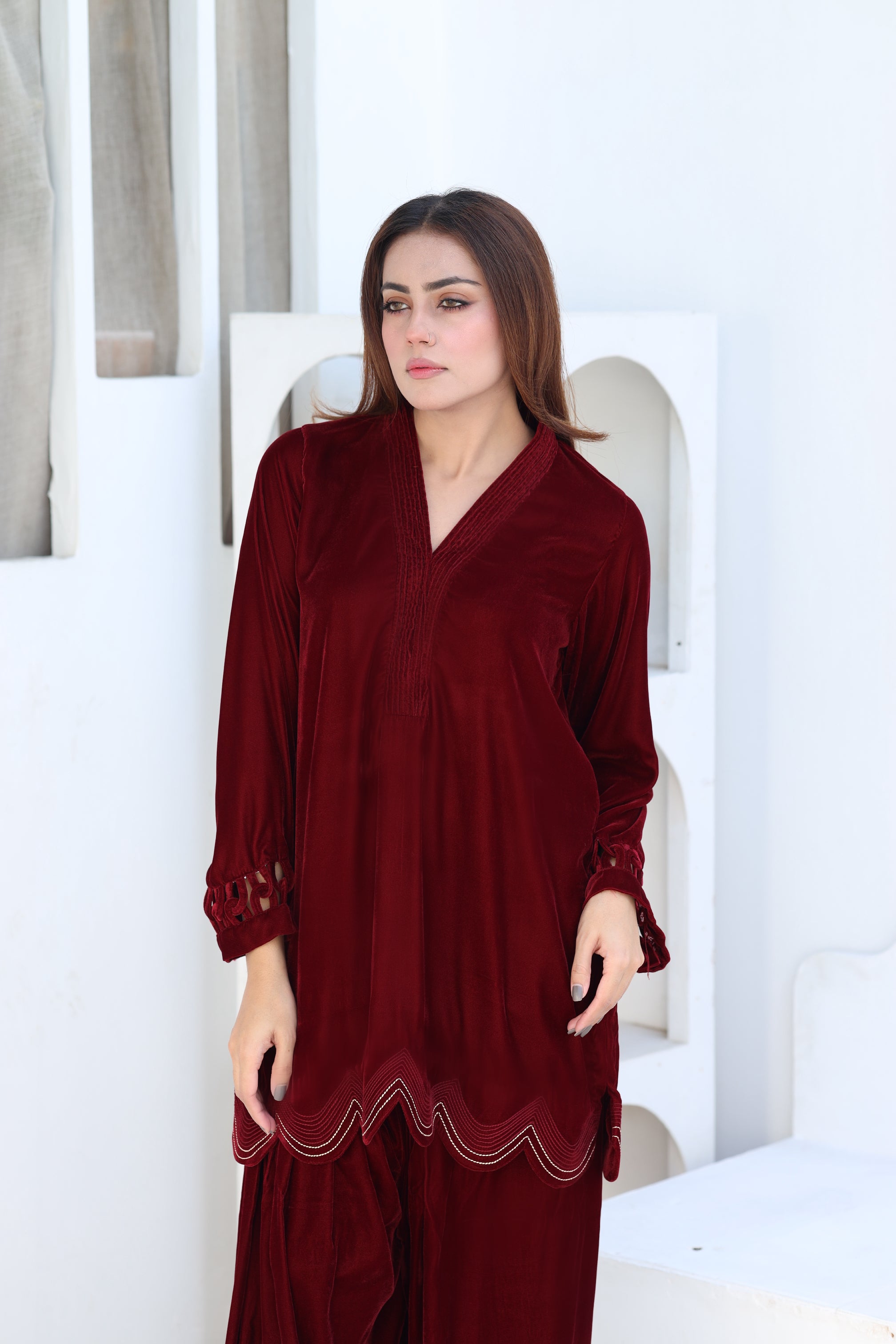 This dress features a rich maroon velvet fabric, ideal for winter festivities or semi-formal events. The outfit consists of a long kurta with intricate cutwork detailing on the sleeves and hemline, paired with loose, pleated trousers. The design is elegant and timeless, combining comfort with sophistication.